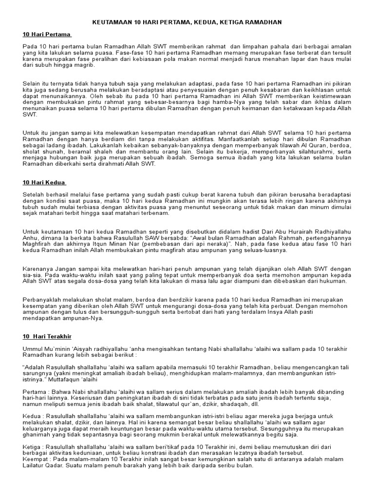 Dalam beberapa riwayat disebutkan bahwa hari 1 bulan dzulhijah adalah hari dimana allah swt mengampuni dosanya nabi adam alaihissalam karena itu disunnahkan berpuasa pada hari itu. Kementrian agama ri sudah memutuskan bahwa awal ramadhan 1439 hijriah jatuh pada hari kamis 17 mei 2018. Keutamaan bulan ramadhan 10 hari pertama pada 10 hari pertama bulan ramadhan allah swt akan memberikan rahmat dan limpahan pahala dari berbagai amalan yang kita lakukan selama puasa.